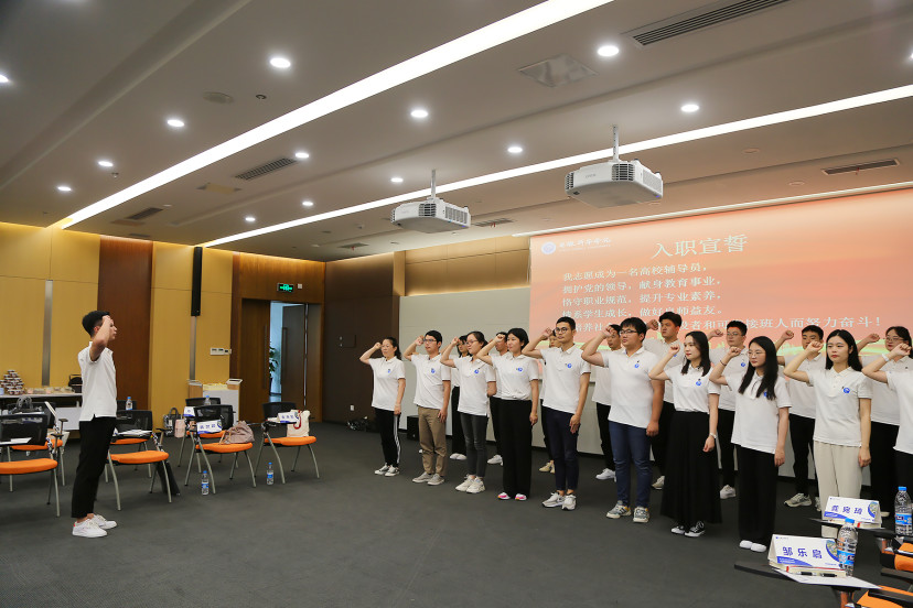 随后,21位新入职辅导员许下铮铮誓言,共同宣誓:“我志愿成为一名高校辅导员,拥护党的领导,献身教育事业,恪守职业规范,提升专业素养,情系学生成长,做好良师益友。为培养社会主义合格建设者和可靠接班人而努力奋斗!”进一步坚定了理想信念和初心使命。