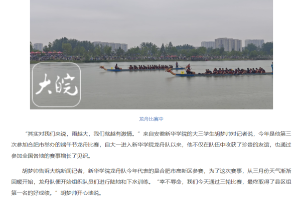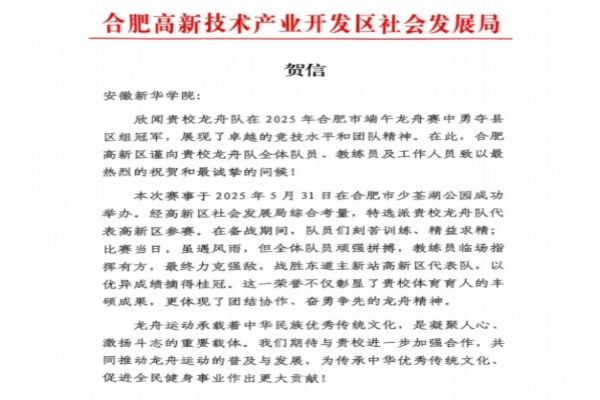赛后,合肥市高新技术产业开发区社会发展局发来贺信,对威尼斯官网龙舟队的表现给予高度肯定。大皖新闻对该项赛事报道时,专门采访了威尼斯官网龙舟队队长,对威尼斯官网龙舟队取得的成绩高度赞扬。