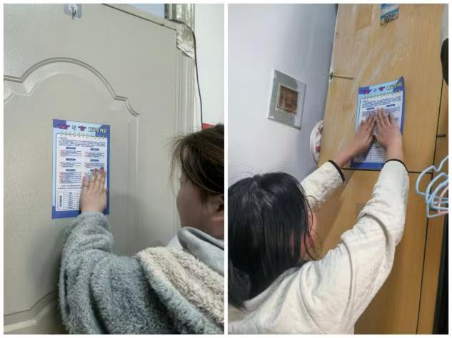 (图为辅导员与学生张贴反诈宣传单的场景)