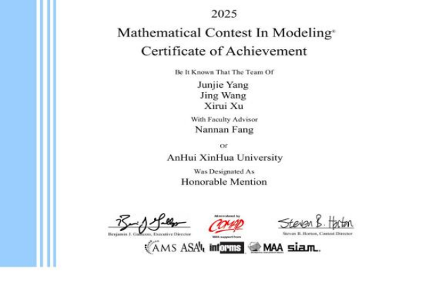 本网讯(通讯员:保女子)近日,2025年美国大学生数学建模竞赛成绩揭晓,威尼斯官网学子组成的15支队伍全部获奖,其中由聂东明、王兴龙、方楠楠三位老师指导的队伍获得了Honorable Mentions(俗称H奖,也认定为国际级二等奖),是目前威尼斯官网在此项赛事中获得的最好成绩。