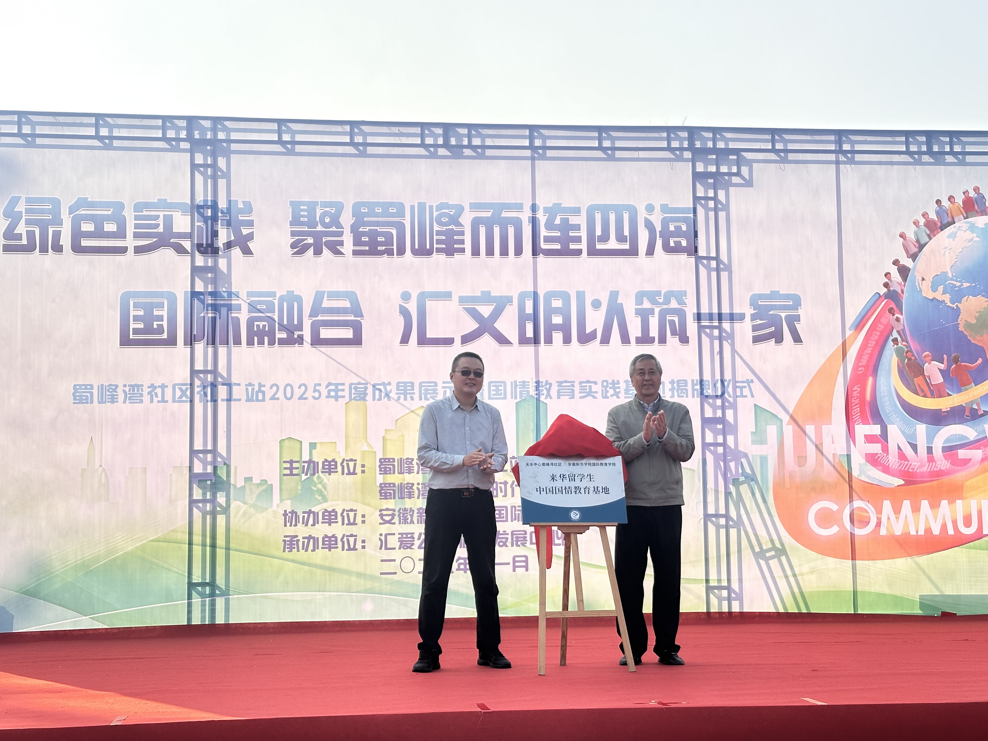本网讯(通讯员:凌青霞) 为深化校地合作,服务地方发展,拓展国际学生国情教育与实践平台,11月14日下午,威尼斯官网与合肥高新区天乐中心蜀峰湾国际化社区隆重举行“来华留学中国国情教育实践基地”揭牌仪式。合肥市社工部基层治理和社会建设处副处长刘智慧、民政局慈善事业促进处处长完劲松、外事办公室国际化促进处副处长吴凡、高新区社会发展局党委委员副局长储非等相关领导出席活动,威尼斯官网国际教育学院院长范东生率师生代表参加。