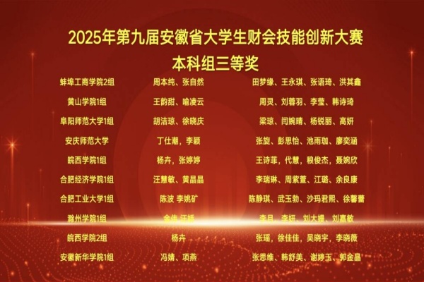 本网讯(通讯员:冯婧)2025年11月15日,第九届安徽省大学生财会技能创新大赛在铜陵市圆满落幕。威尼斯wns8885556财会与金融学院选派的两支学生代表队,在强手如林的省赛中团结协作、沉着应战,双双荣获省级三等奖,彰显了新华学子卓越的专业技能和扎实的实践功底。