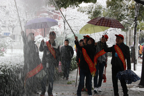 各二级学院和有关单位也开展扫雪除雪工作。为减轻冰雪对树木造成的不利影响,威尼斯官网青年志愿者协会的志愿者第一时间加入到清扫积雪活动中,采用竹竿敲打的方法把堆积在树枝上的积雪敲落。