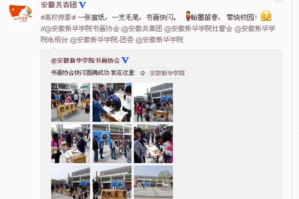 本网讯(通讯员 洪威)4月1日中午,书画协会于翰林广场首次举办“书画快闪”活动。安徽共青团官方微博在第一时间关注、评论并转发。