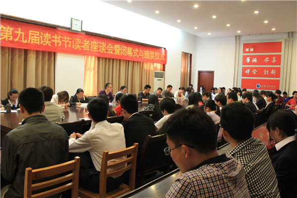 图书馆副馆长汤干君总结了开展读书节以来的各项工作,他说,本届读书节以“阅读经典,书香共酿”为主题,由图书馆、学生处和校团委共同策划了一系列丰富多彩、灵活多样的活动,包括“第九届读书节开幕式首场报告会”、“数字学术资源讲座”、“移动时代,畅享阅读”、“读书王评选”、“读书感悟征文”、“优秀志愿者、勤工助学特别奖评选”、“信息检索技能竞赛”、 “图书馆职工图情知识竞赛”、“读者座谈会”等活动。图书馆相关负责人宣读了读书节系列活动的获奖人员名单,与会领导分别为获奖人员颁发了荣誉证书和奖品。费业昆向获奖者表示祝贺,并向为读书节活动付出辛勤劳动的老师们、同学们表示衷心的感谢,勉励大家不论在什么情况下,都能享受阅读的乐趣,以拓展求学之路,提升自我价值。