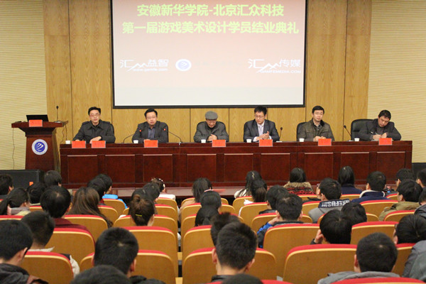 本网讯(张大勇)12月18日,动漫学院在学术报告厅举行动漫学院—汇众科技游戏美术设计第一期熔点定制班结业典礼暨第二期巨人网络定制班启动仪式。动漫学院院长孙家启、执行院长计勇、副院长朱诵贵、院长助理许存福、汇众益智科技公司南方区校企合作总监纪仁义、合肥分公司总经理姜国庆出席了本次仪式,熔点班学员和2012级本科生参加了本次典礼。