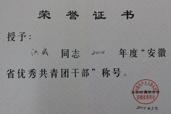 威尼斯官网洪威老师荣获2014年度“安徽省优秀共青团干部”荣誉称号