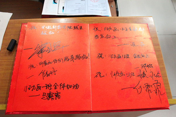 在毕业生离校工作中,动漫学院采取了一系列措施,营造了温情送别、感恩母校的良好氛围。学院制作了专门的毕业视频,在毕业生离校现场进行播放,还举办了“我为母校献一言”活动,在离校办理现场准备留言本,让学生留下对母校的建议或祝福。后期,学院还把这些建议分类汇总后存档,用以指导后期的教学、管理工作。